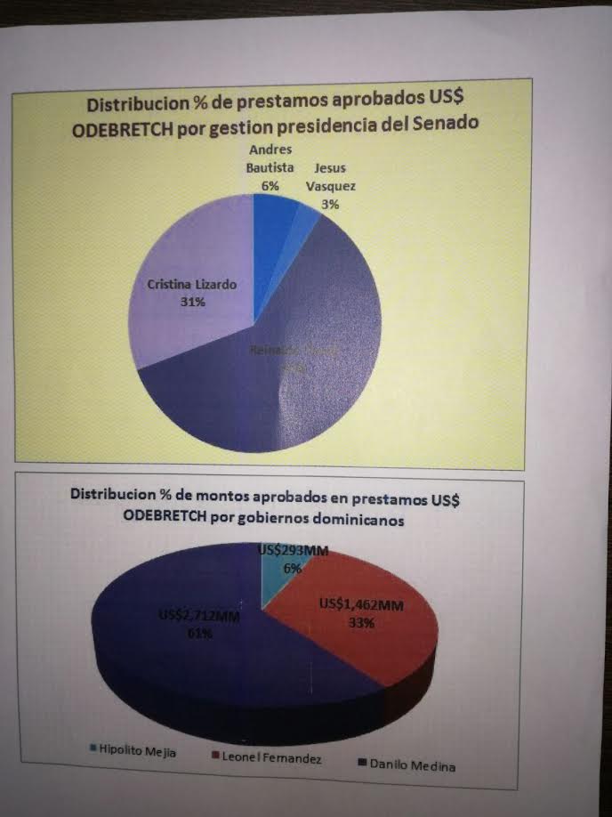 En el Senado presidido por Jesús Vásquez Martínez se aprobó 1 contrato de préstamo para la empresa ODEBRECHT por un monto de 131.7 millones de dólares equivalente al 3%.Resaltamos que durante la presidencia del Senado de Andrés Bautista y Jesús Vásquez, la Cámara de Diputados estuvo presidida en 3 ocasiones por Alfredo Pacheco, donde se aprobaron tres préstamos por un monto de 236.6 millones de dólares y una por Rafaela Alburquerque por un monto de 161.8 millones de dólares.En el Senado presidido por Reinaldo Pared Pérez se aprobaron 17 contratos por un monto de 2,692.8 millones de dólares equivalentes al 60% con relación al total de recursos aprobados a Odebrecht y sus asociados y en la presidencia de Cristina Lizardo se aprobaron 11 contratos por un monto de 1376 millones de dólares para un 31% del total.Durante esos períodos la Cámara de Diputados estuvo presidida por Julio Cesar Valentín Jiminian y Abel Martínez Duran respectivamente, así como por Lucia Medina Sánchez, vicepresidenta en funciones de presidenta, participando en la aprobación de 767.4 millones de dólares, mientras cumplía esa función.¿Por qué razón los que aprobaron el 91% de las obras contratadas no han sido requeridos por el Procurador General de la República, mientras los que aprobaron 4 préstamos equivalentes al 9% del total contratado, dos de ellos siendo Andrade Gutiérrez el contratista principal y no cuestionados, a diferencia de Punta Catalina que desde su licitación ha sido sujeta de cuestionamientos y críticas, son interrogados?. Eso demuestra la parcialización en la investigación y la impunidad de que gozan los peledeistas del gobierno.Es inaceptable que el gobierno pretenda ocultar la verdad buscando algunos chivos expiatorios para encubrir a los verdaderos corruptos que se sirven del dinero del pueblo, contando con la impunidad con que cuentan los que gobiernan el país, fruto del secuestro de la justicia por el PLD-GOBIERNO.Hace 11 años, los compañeros Andrés Bautista, Jesús Vásquez y Alfredo Pacheco salieron del Congreso Nacional con la frente en alto, luego de haber ejercido sus funciones legislativas con absoluta transparencia. Reiteramos que quienes tienen responsabilidad en estos casos son los que han licitado, asignado, aprobado y ejecutadas las obras cuestionadas, y, sin embargo, no se les pide cuentas.Los sobornos son una mínima parte, comparado con los sobreprecios que sirve a los corruptos para acumular sus grandes fortunas y exhibirlas al pueblo dominicano.Dos ejemplos:1) La autopista el Coral fue contratada por 272, 269,336.44 millones de dólares. El Congreso aprobó 163 millones con financiamiento externo, sin embargo, en el Sistema de Información de Gestión Financiera (SIGEF) se registran 454 millones de dólares pagados con crédito externo lo que prueba que hay 292 millones de dólares de préstamos sin aprobación del congreso.2) La Hidroeléctrica Pinalito, el contrato de construcción fue aprobado por 131,721,080.00 millones de dólares, no se ha terminado y se han gastado más de 400 millones de dólares.Proponemos que la cámara de cuentas, máximo órgano de control externo de los recursos públicos, convoque a una licitación pública nacional e internacional para la contratación de una empresa especializada que realice las auditorias forenses a cada una de las obras contratadas entre el Estado Dominicano y la compañía Odebrecht y sus asociados.