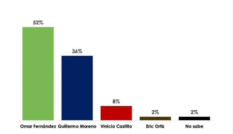 El candidato a la senaduría por el Distrito Nacional en la alianza Rescate RD, Omar Fernández, aventaja con 16 puntos porcentuales a Guillermo Moreno, candidato del Partido Revolucionario Moderno y aliados en la más reciente encuesta publicada.